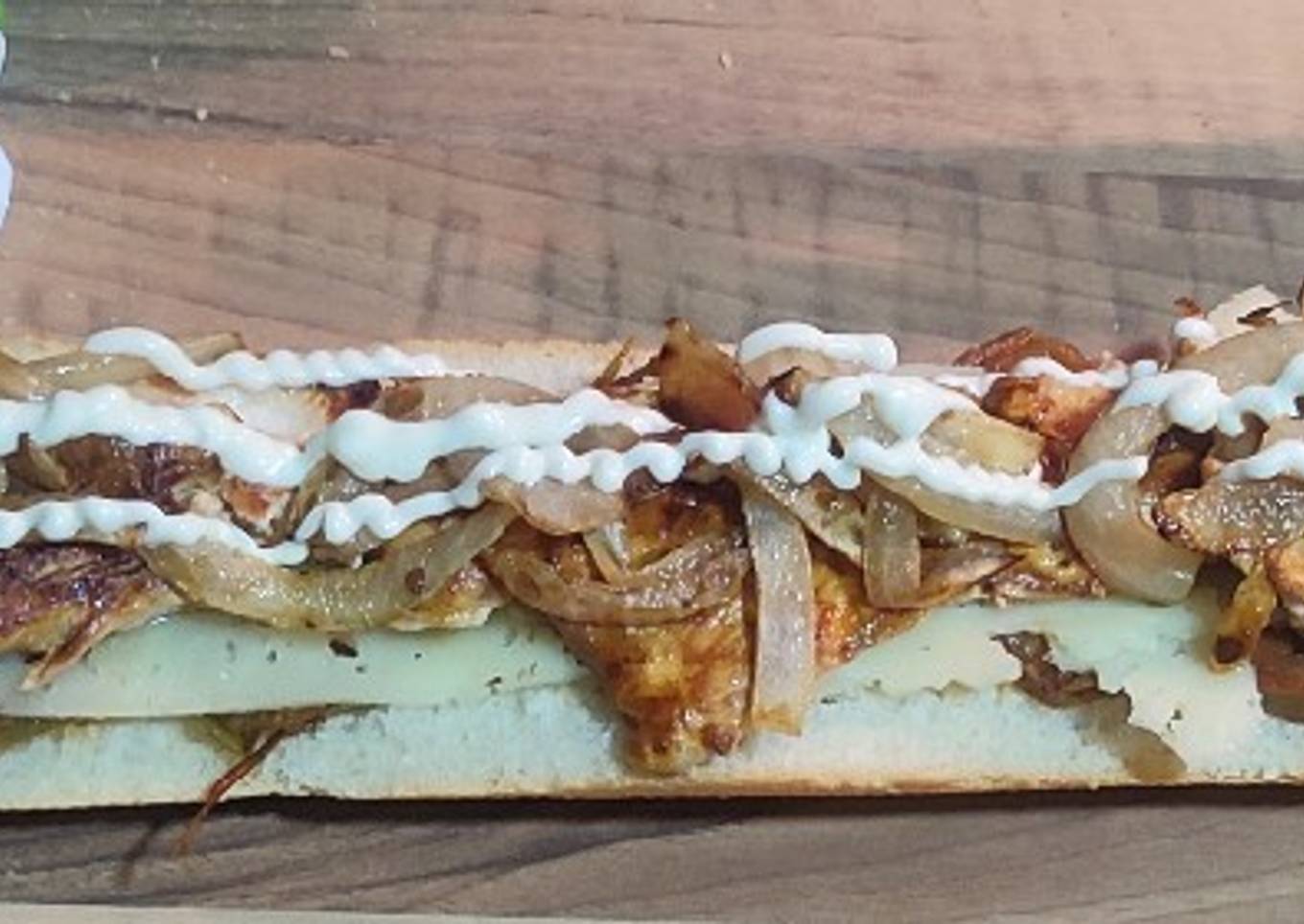- Con la barra de pan abierta a la mitad, echamos la mayonesa, el tomate en rodajas, el filete de pollo a la plancha, el queso havarti, la cebolla pochada, las tortillas de francesa, el pavo, el bacon y el Rulo de cabra