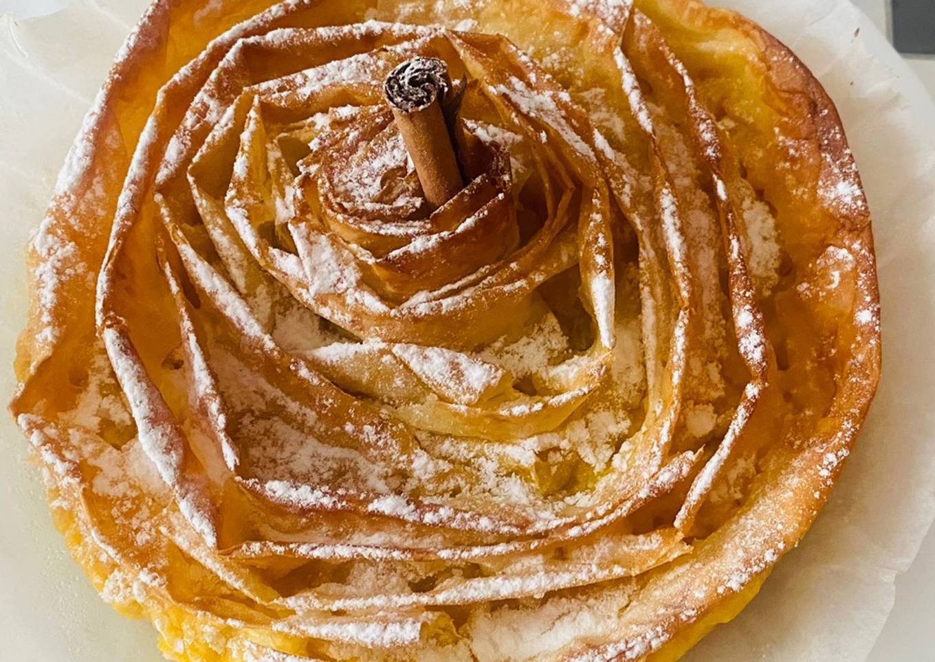 - Sacamos la flor dorada del horno, ponemos en el centro una rama de canela y con una jarra muy despacio, vamos rellenando los huecos de la flor