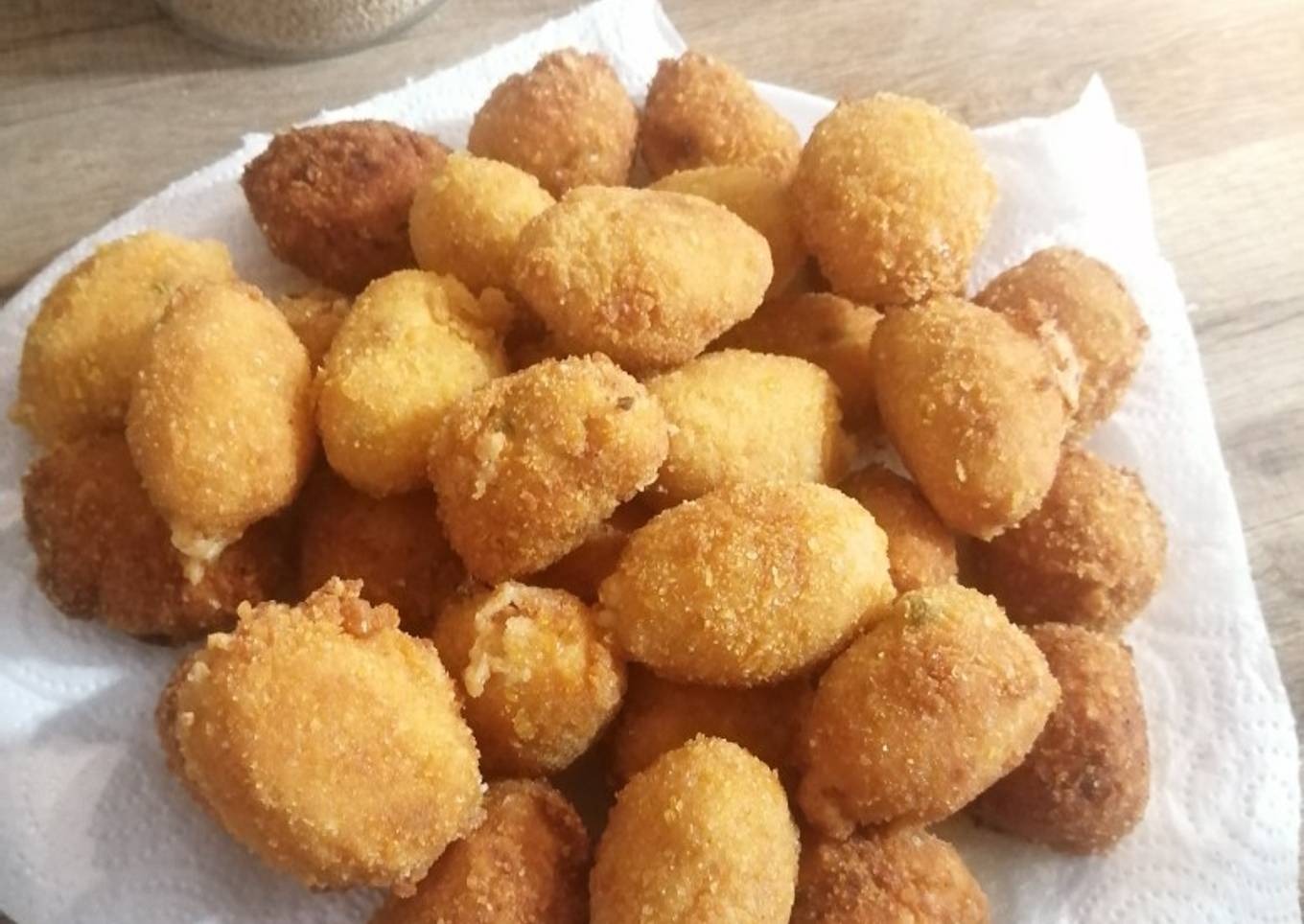 - Cuando tengamos la masa fría después de estar unos 40 min en la nevera (la mía está tibia) tenía prisa, pero no pasa nada solo hay que controlar bien la temperatura al freír para que no explote. Boleamos y pasamos por harina, huevo y pan rallado, todo salpimentado.