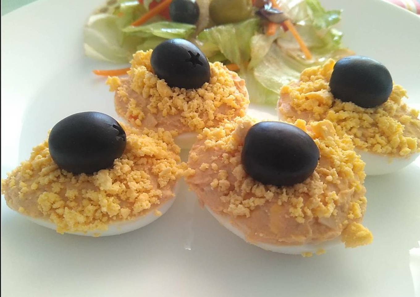 - Por último, decoramos con yema triturada y colocamos una aceituna en cada mitad.